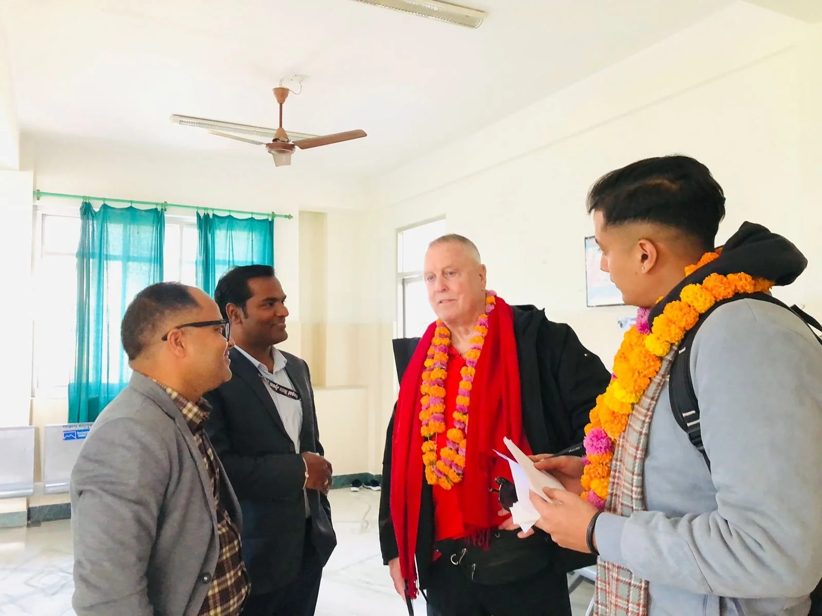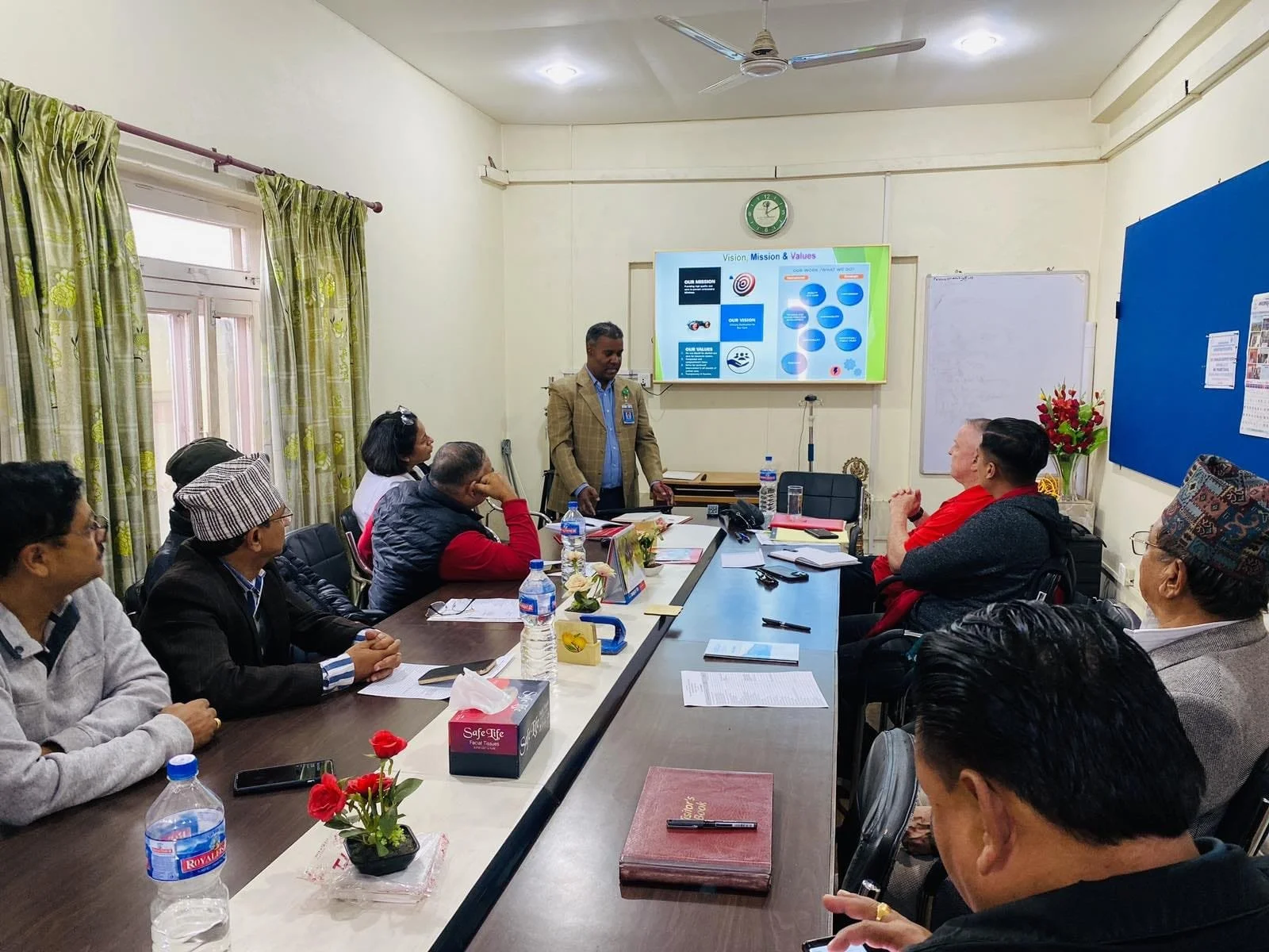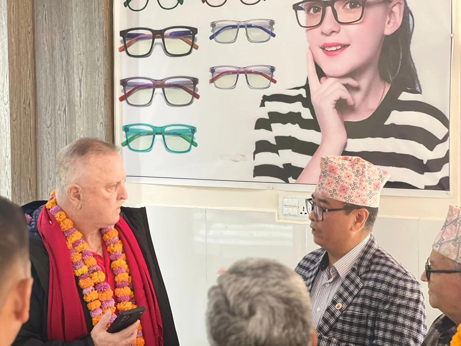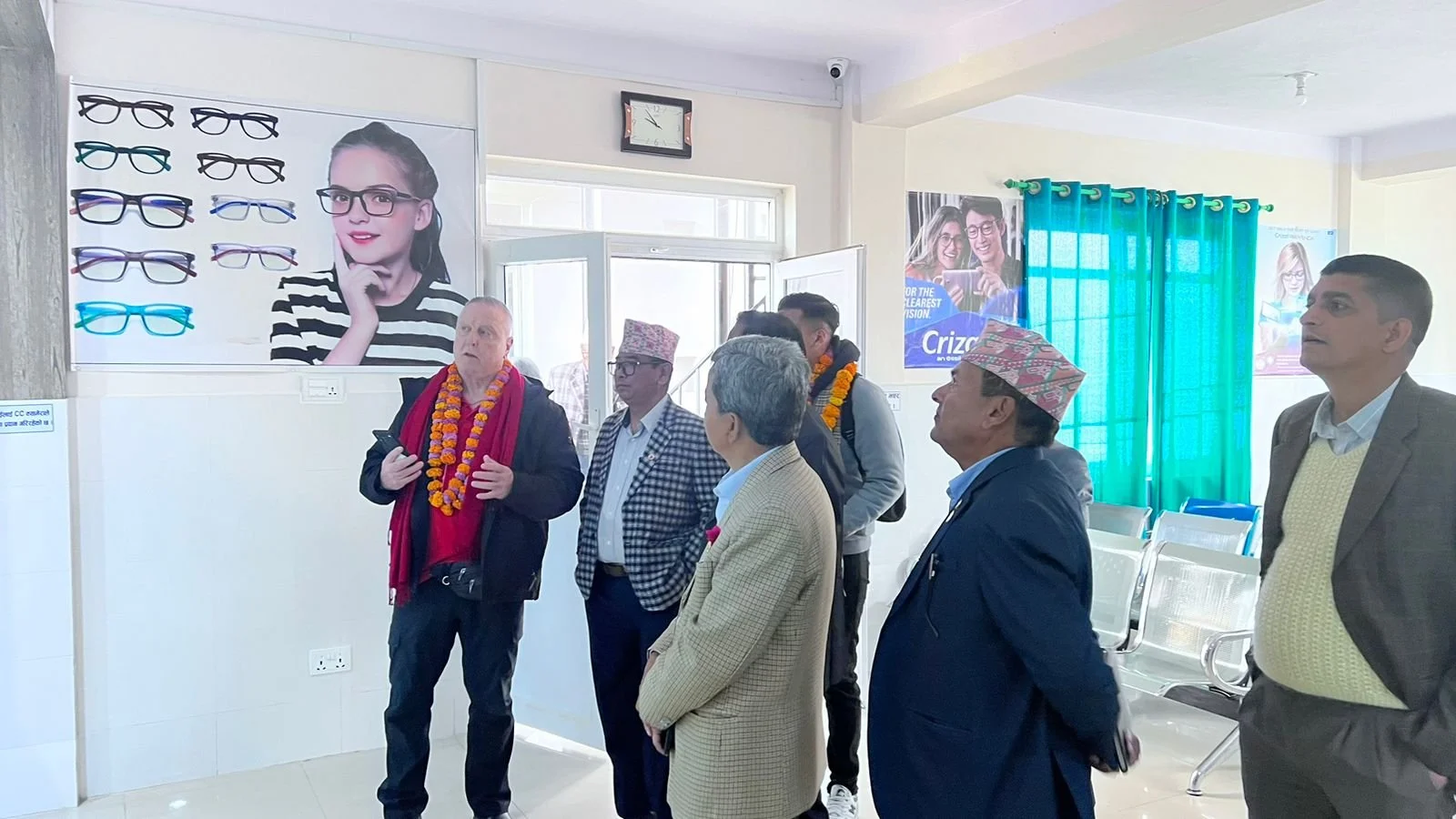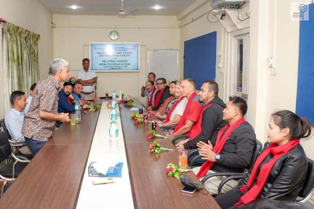 Helping Hands President Mr. Narayan Shrestha visiting Bharatpur Eye Hospital, Chitwan. The Management Committee of the hospital organized a welcome ceremony for Mr. Shrestha and gave a brief presentation of how the reading glasses donated by Helping Hands are being distributed.